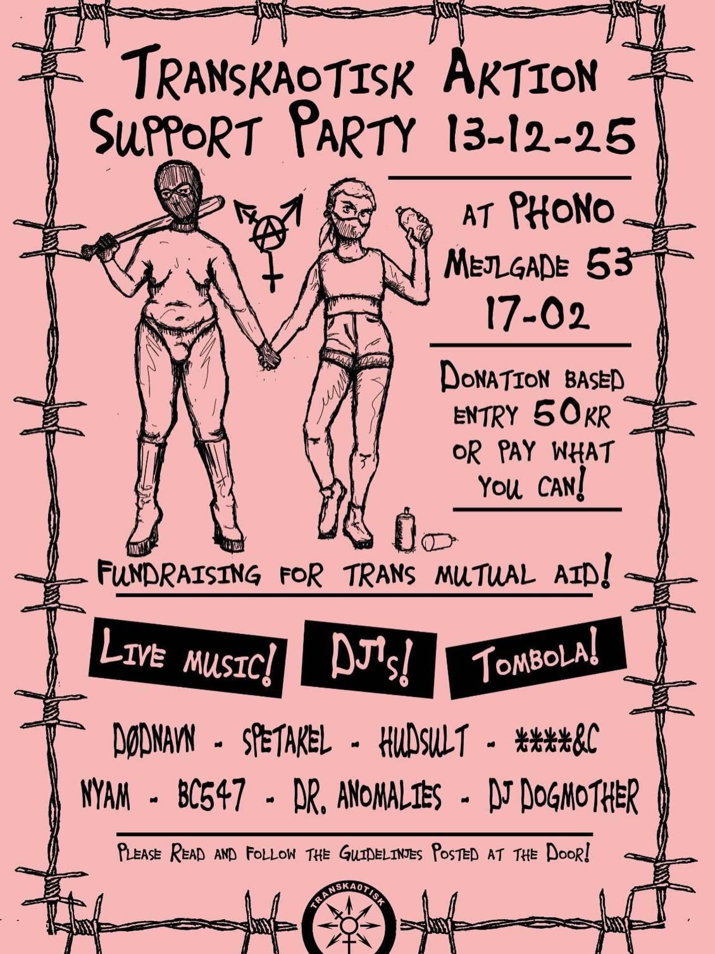 Kære transer og allies, Kom til Transkaotisk Aktions Støttefest den 13. december på Phono, Mejlgade 53 fra 17-02! Vi samler penge ind til vores arbejde med trans mutual aid i Aarhus! Der vil være live musik af Dødnavn, Spetakel, Hudsult, ****&c og NYAM, tombola med præmier og dj sets af BC547, Dr. Anomalies og dj dogmother. Indgangen er donationsbaseret på 50 kr eller betal hvad du kan! Venligst læs og følg retningslinjerne som hænger ved indgangen. Tilbage til forsiden